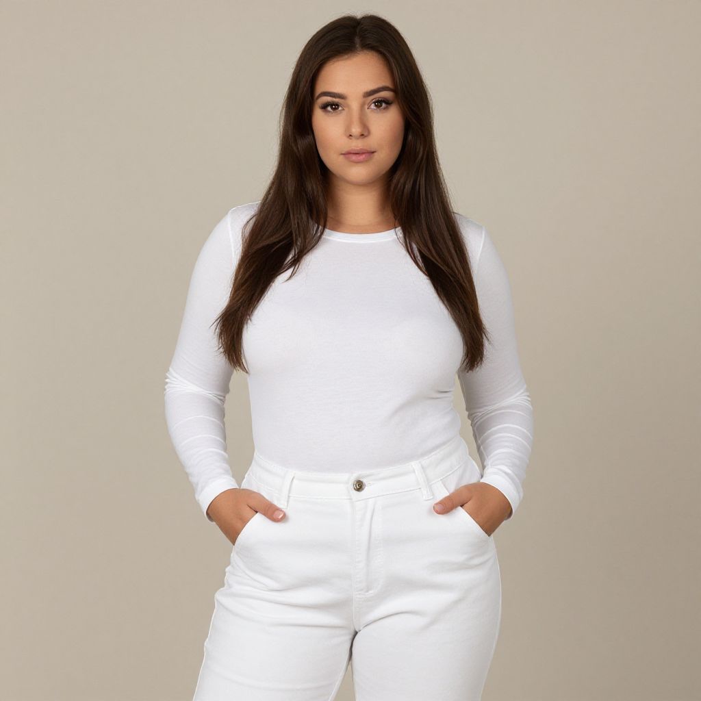 Photograph of a young white woman with wavy, shoulder-length brown hair and light skin, standing against a plain white background. She wears a black, long-sleeve, V-neck blouse and high-waisted, black leather pants. Her blouse has a slightly sheer texture, subtly revealing the outline of her small to medium-sized breasts. She has a neutral expression, with slightly parted lips and direct eye contact with the camera. The lighting is bright and even, highlighting her features and outfit. Her overall style is modern and chic.