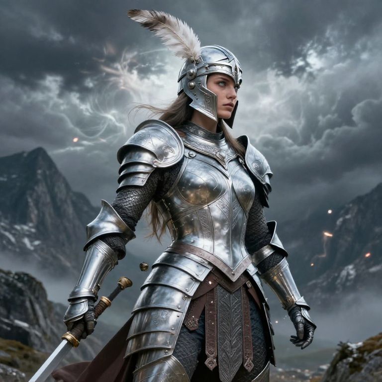 Digital artwork of a fierce female knight in silver armor with white feathered helmet, holding a sword, standing amid stormy mountains.