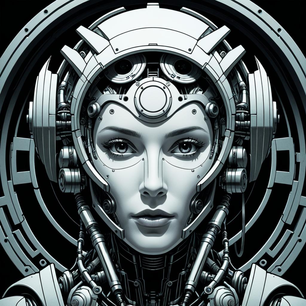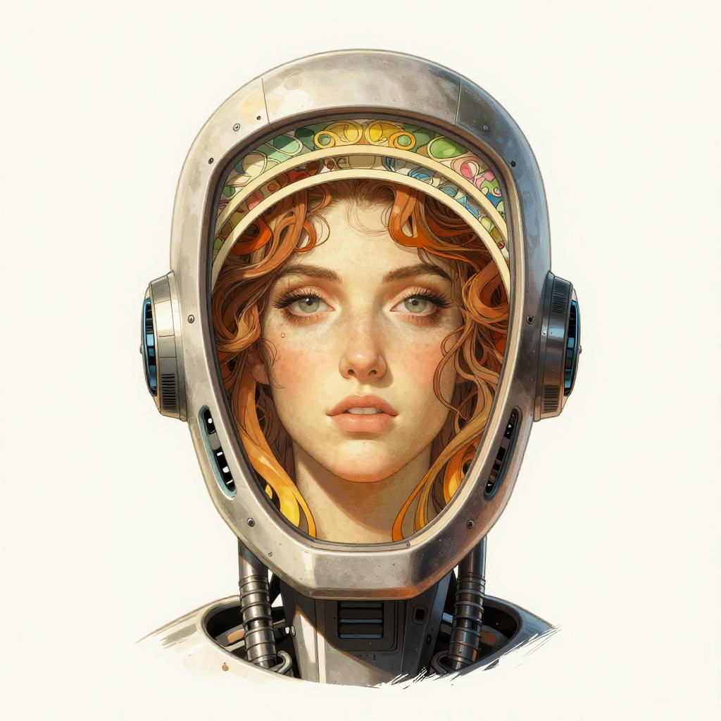 Illustration of a hollow robot head with layered transversal cuts revealing a human female head inside. Highly detailed, in the style of Mike Mignola and Alphonse Mucha, centered, 4K, character concept, digital art
