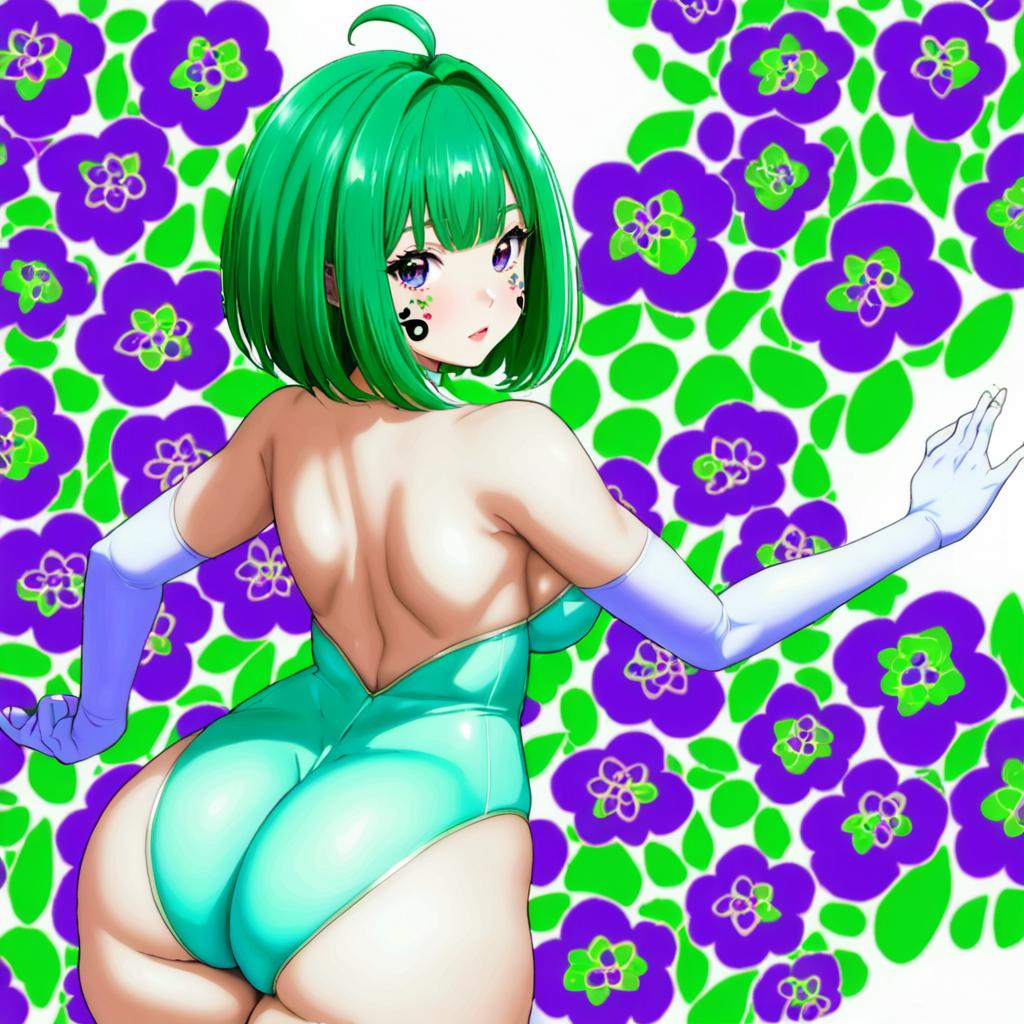 Kannagi itsuki, sora wo kakeru shoujo, 1girl, purple eyes, green hair, short hair, long hair, ahoge, large breasts, ass, blue leotard, white leotard, elbow gloves, thighhighs, facial mark, by artist mamuru, anime