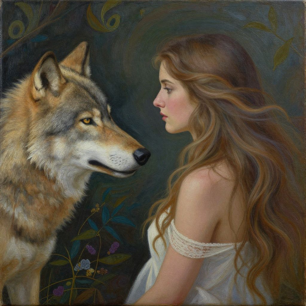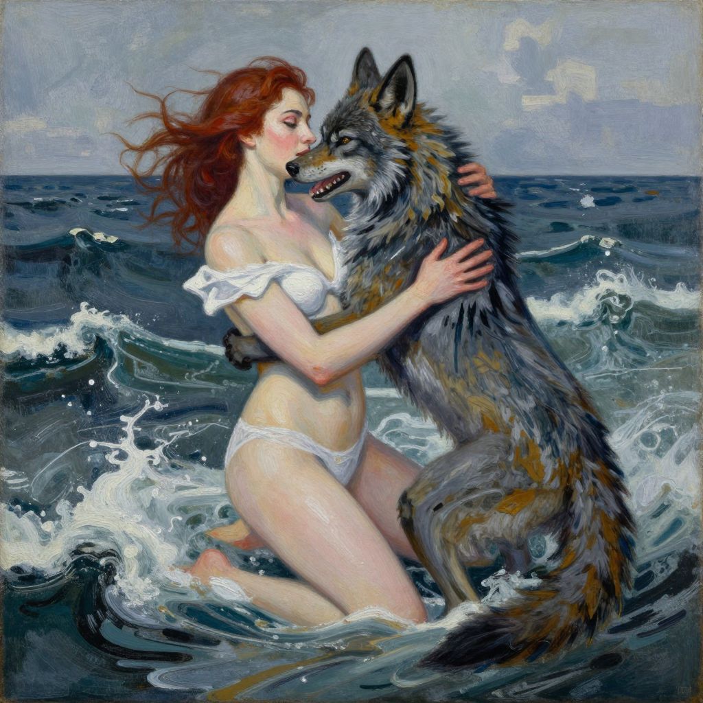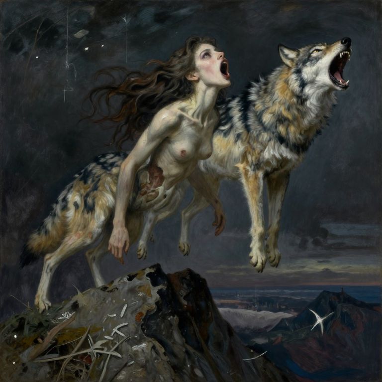 Digital painting of a topless woman with long brown hair, mid-transformation into a snarling, multi-colored wolf on a dark, rocky cliff