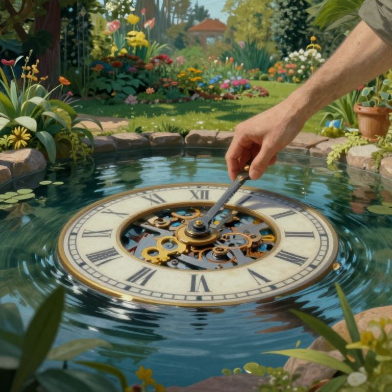Photograph of a hand turning a clock submerged in a garden pond, surrounded by vibrant flowers and lush greenery.
