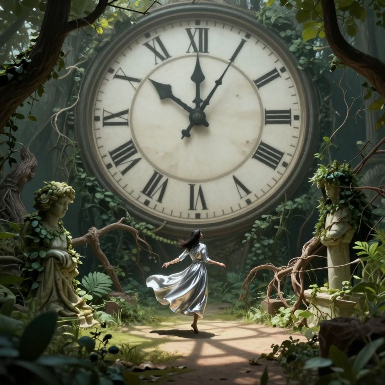 Craft an image blending surreal digital art with impressionistic elements, depicting a dreamlike garden setting where the hands of a colossal timepiece are submerged in a serene pond, revealing its intricate workings beneath the rippling water. This scene should be captured from a low-angle perspective that emphasizes the intimate connection between nature and the distorted notion of time, creating an emotional spectrum that highlights the fluidity and surreal interaction of elements within the tranquil landscape.