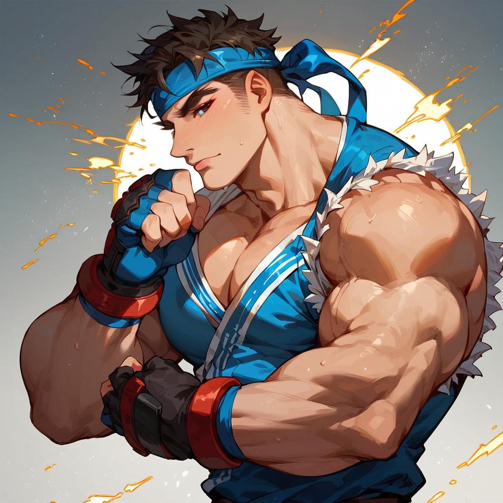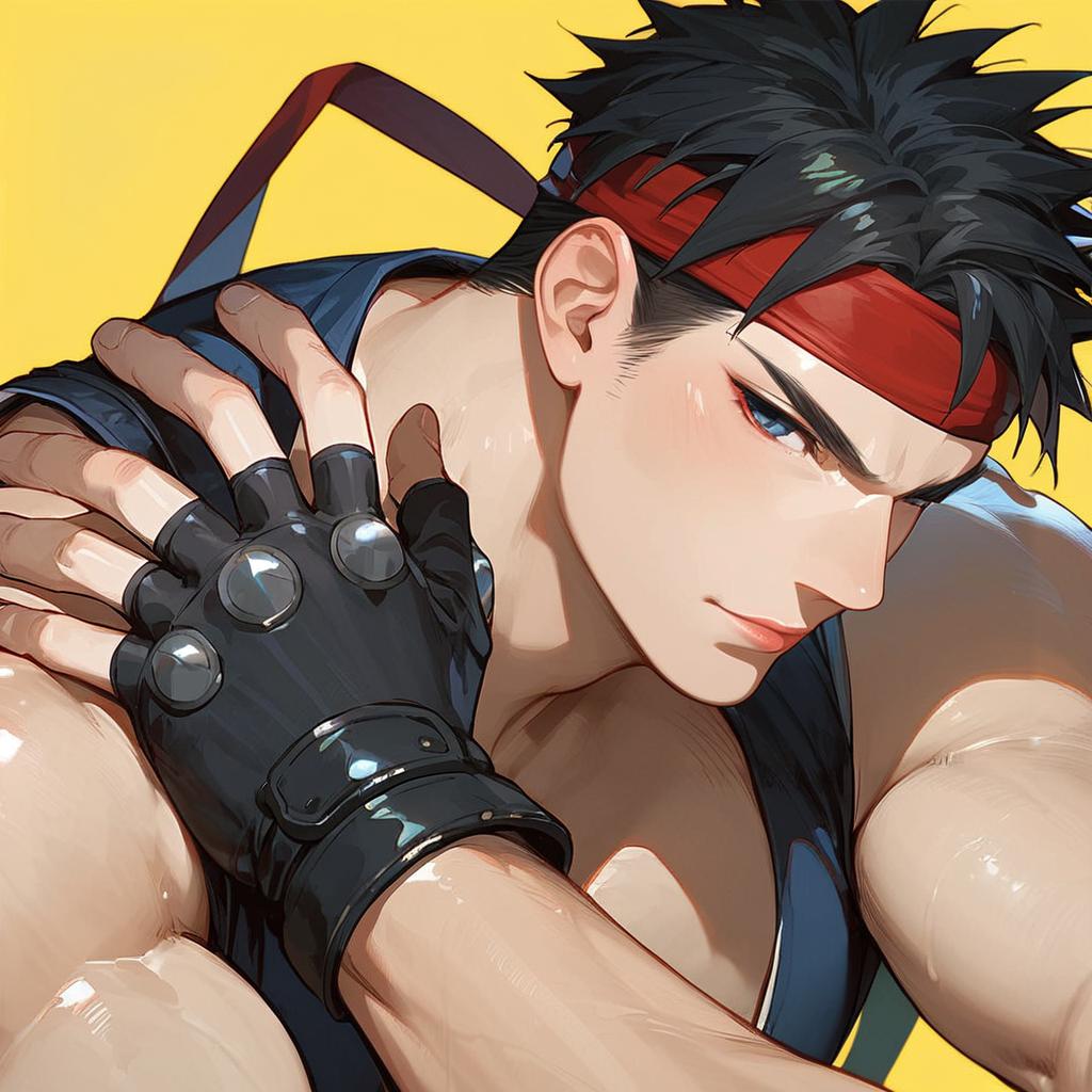 Score_9, score_8_up, score_7_up, ryu (street fighter), solo, dougi, headband, muscular, gloves, thick eyebrows, fingerless gloves, short hair