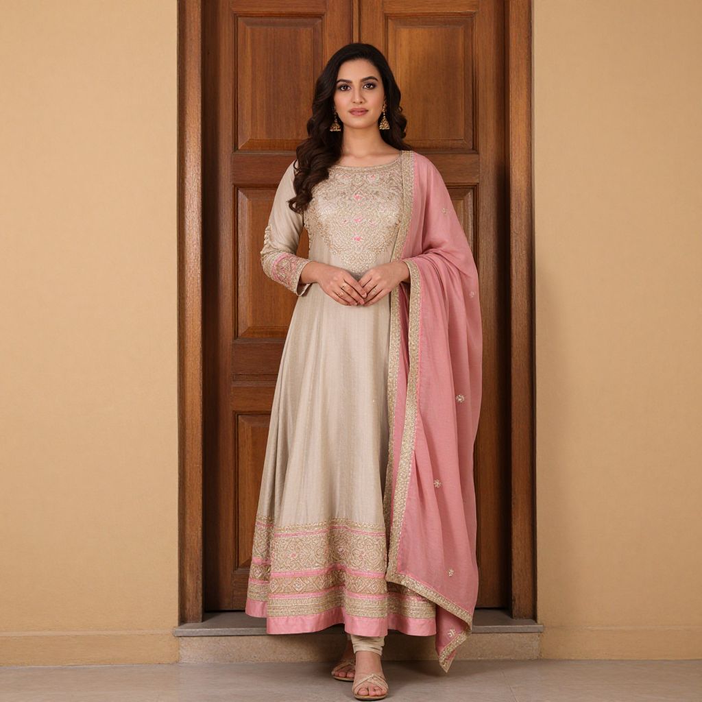 Photograph of a young woman with long, wavy dark hair, standing in front of a wooden door. She wears a traditional Indian outfit: a cream-colored, long-sleeved, full-length kurta with intricate gold embroidery on the chest and hem, paired with a pink dupatta (shawl) adorned with gold borders. Her dupatta is draped over her right shoulder and her left hand holds the edge. She wears strappy, gold sandals. The background is a plain, beige wall. She has a fair complexion and is looking directly at the camera with a gentle smile. The lighting is warm, highlighting her attire and features.