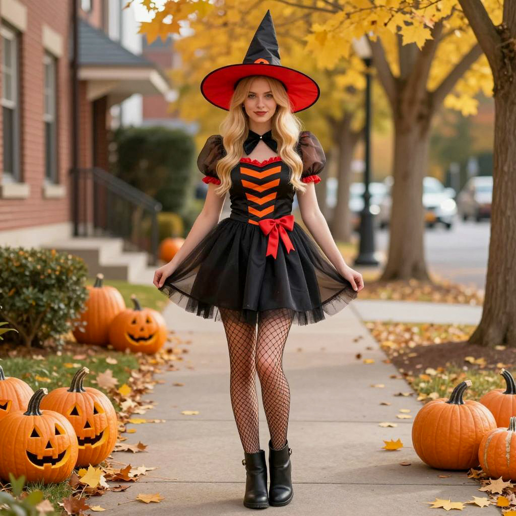 Topgun halloween costume, photorealistic, full-body shot, young woman, long wavy blonde hair, wearing witch hat with black band and white symbol, black short-sleeved jacket, white shirt, red skirt with pink lining, black knee-high boots, holding black gun, standing on porch, bright daylight, orange pumpkin with jack-o'-lantern face in background, beige walls, black column on right, casual Halloween costume, confident expression, realistic ures and lighting, digital photography, high detail, front-facing view, slightly overexposed lighting, autumn atmosphere