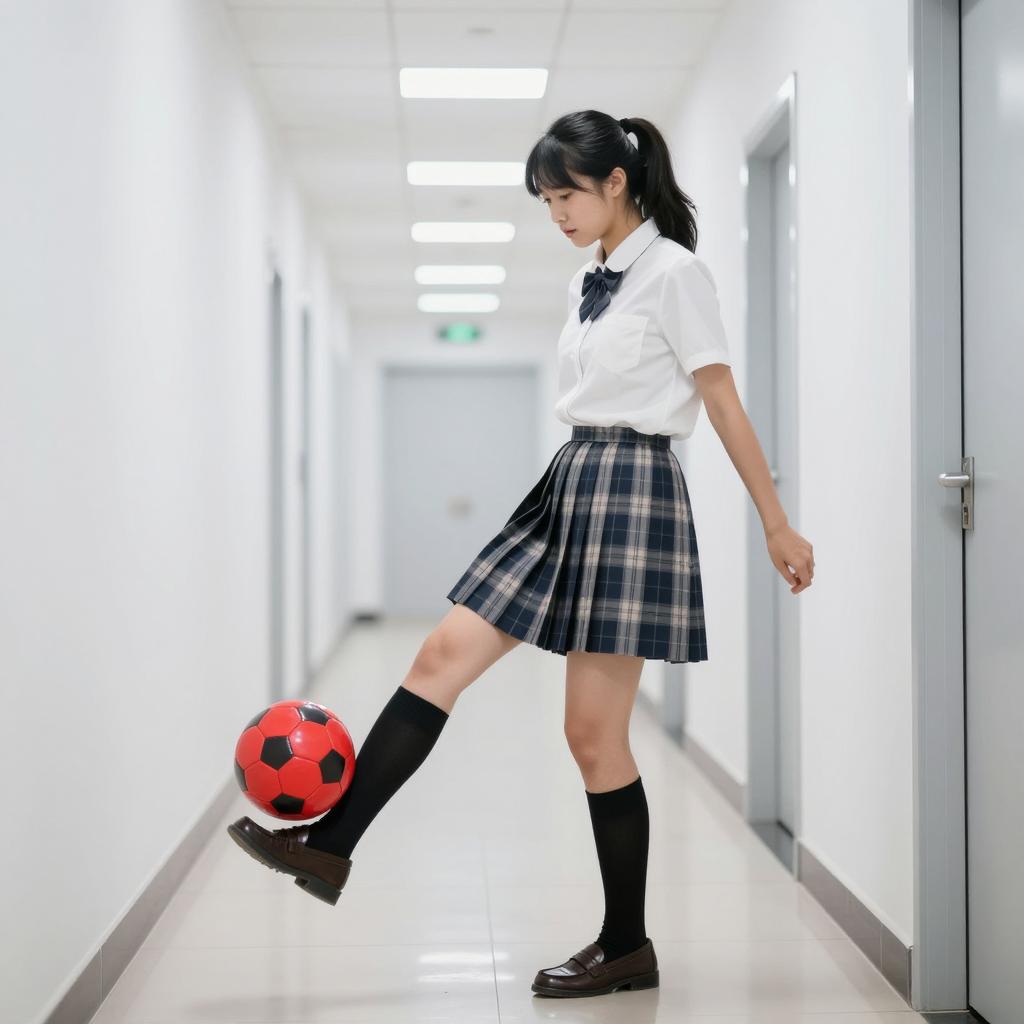 Asian woman in white school uniform and plaid skirt, black knee socks, brown loafers, kicking red soccer ball with right leg. Long black ponytail, white hallway, bright fluorescent lights. Mid-kick, face neutral. Single person. Photographic style.