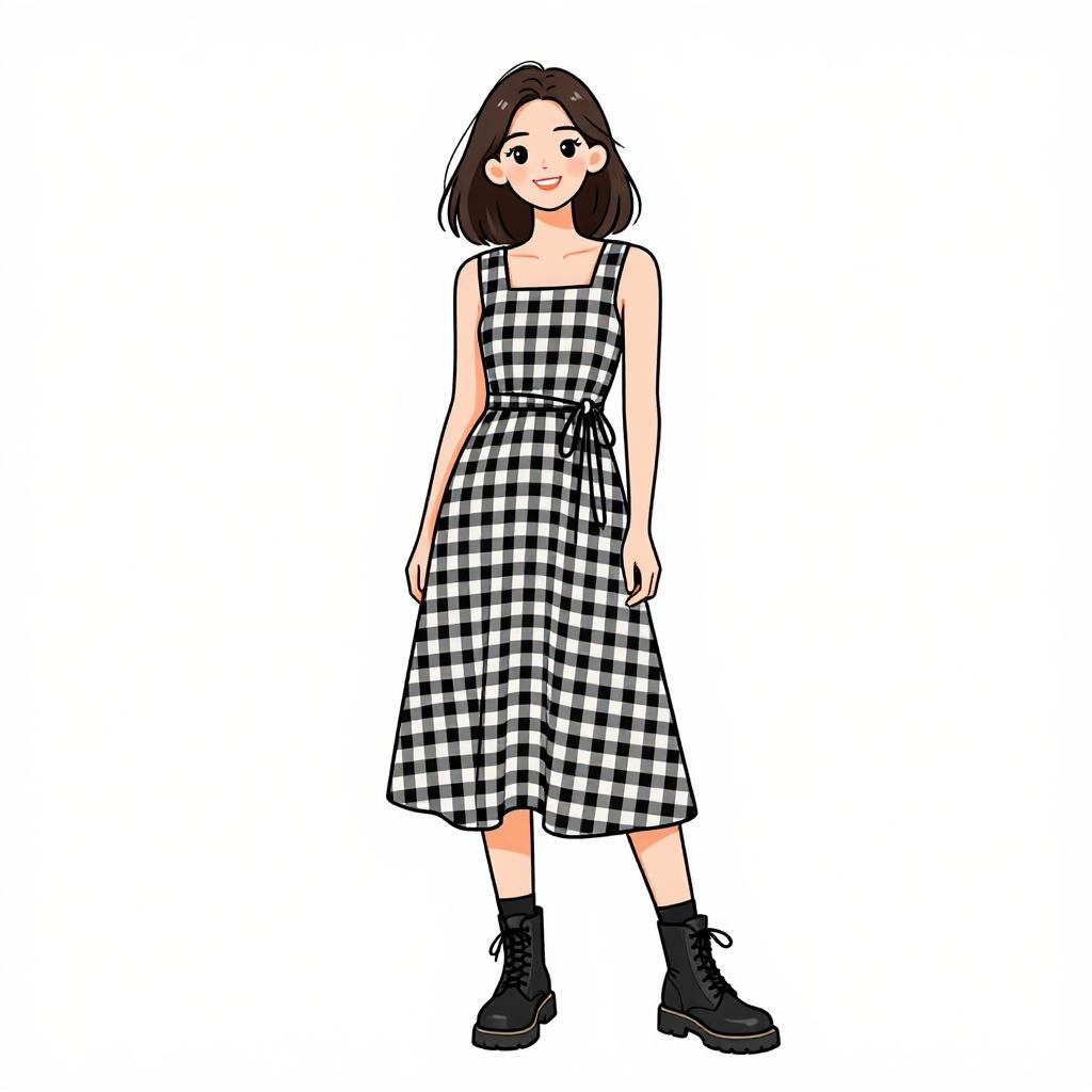 Woman with pretty face and pretty hair. smiling Woman, casual retro, sleeveless midi dress with large black and white gingham pattern, square neckline, tie-waist detail, A-line skirt with ruffled hem, ankle-length black socks, chunky black combat boots, plain white background. --sref 1467
