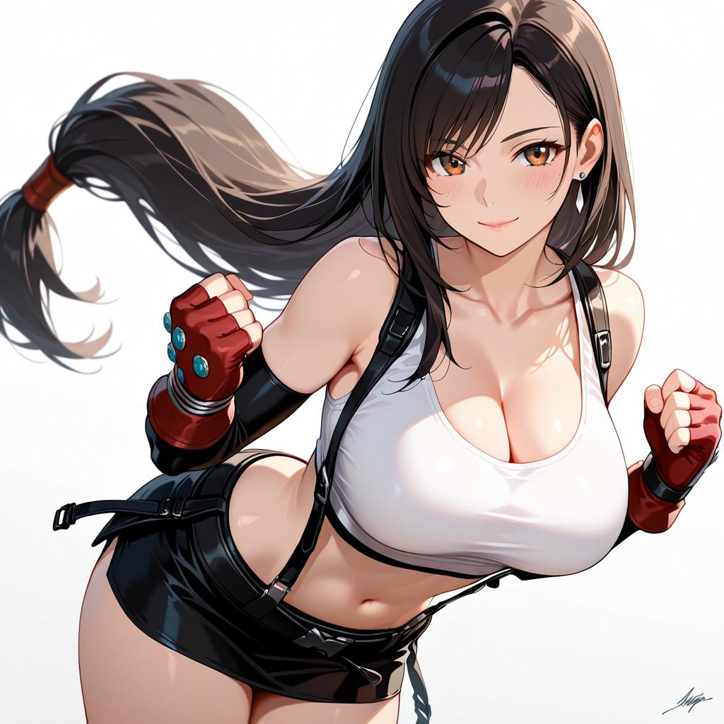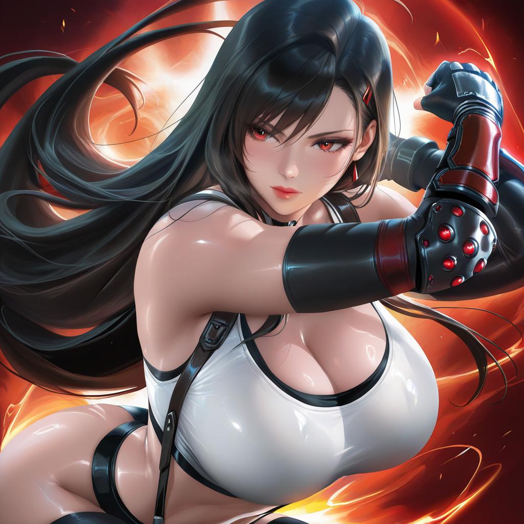 1girl, grey eyes, long hair, aiming at viewer, holding pistol, handgun, masterpiece, detailed shadows, detailed light, highly detailed, best quality, HD, 4K, high quality, teeth, ziya, looking at viewer, tifa lockhart
