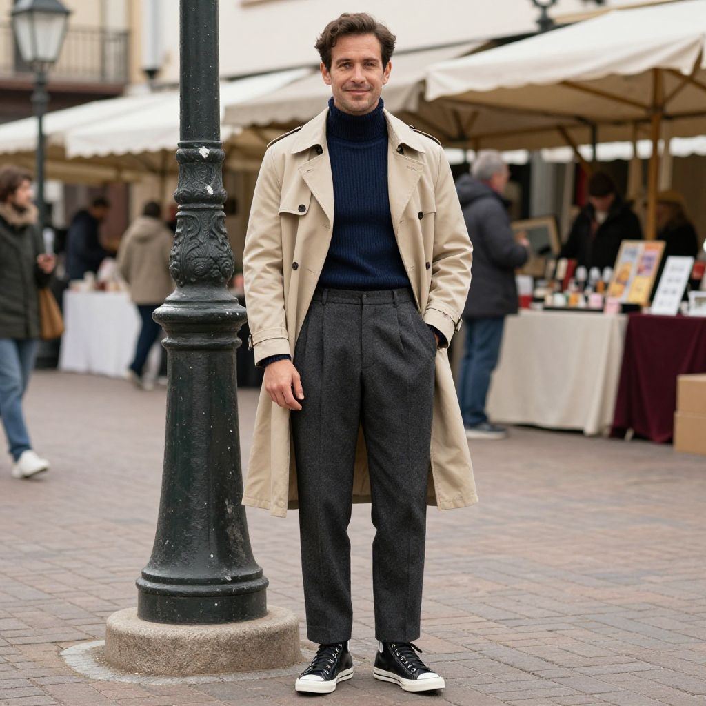 Photograph of a stylish man with light brown coat, black turtleneck, high-waisted gray trousers, and white sneakers, standing beside a