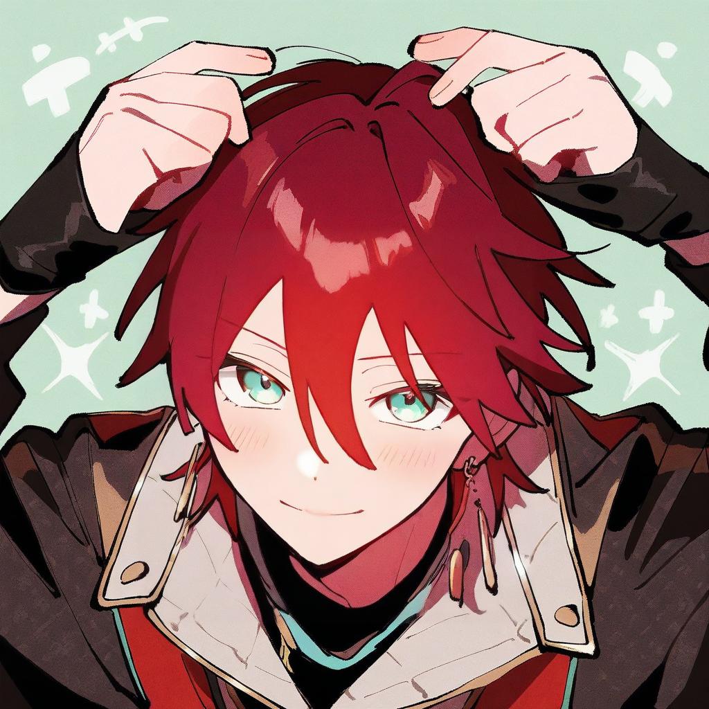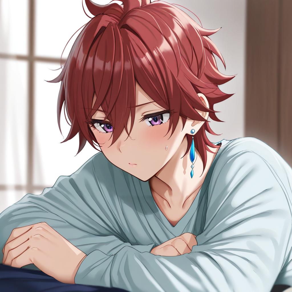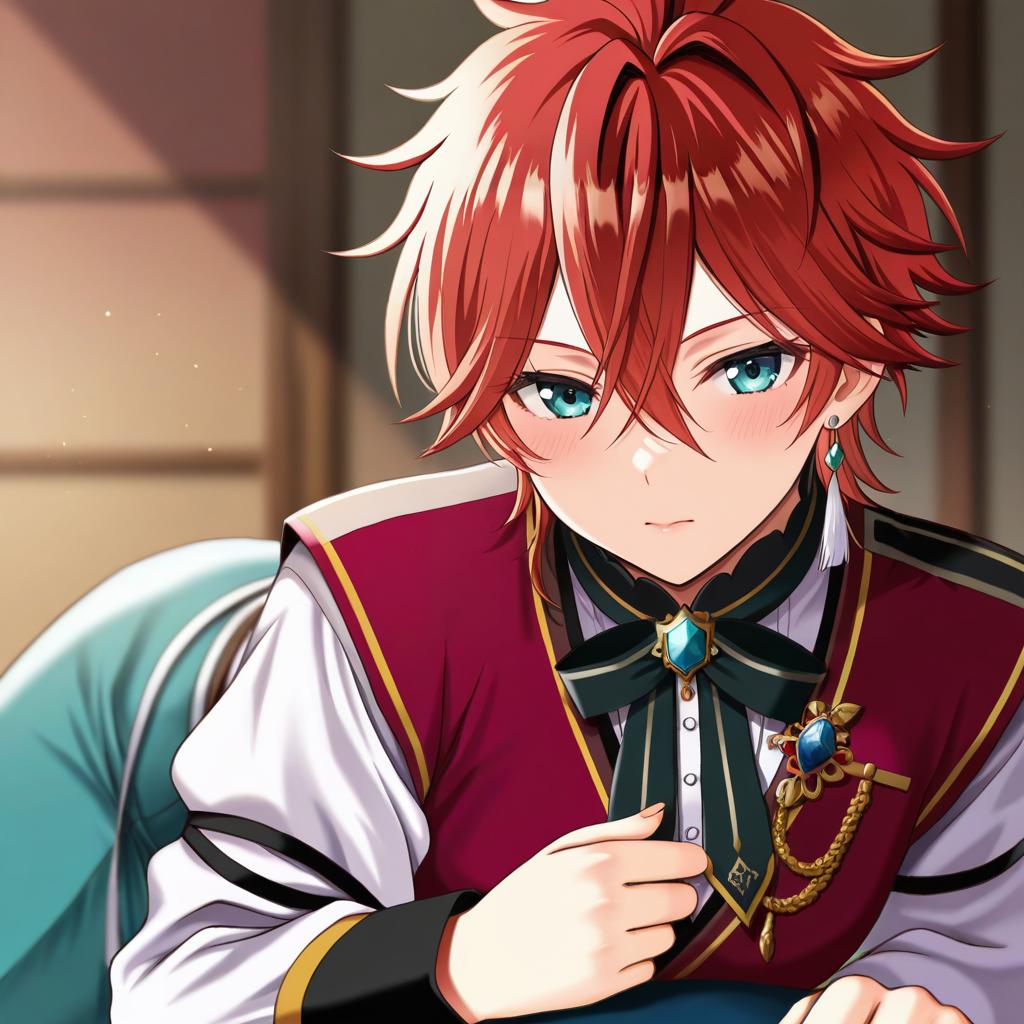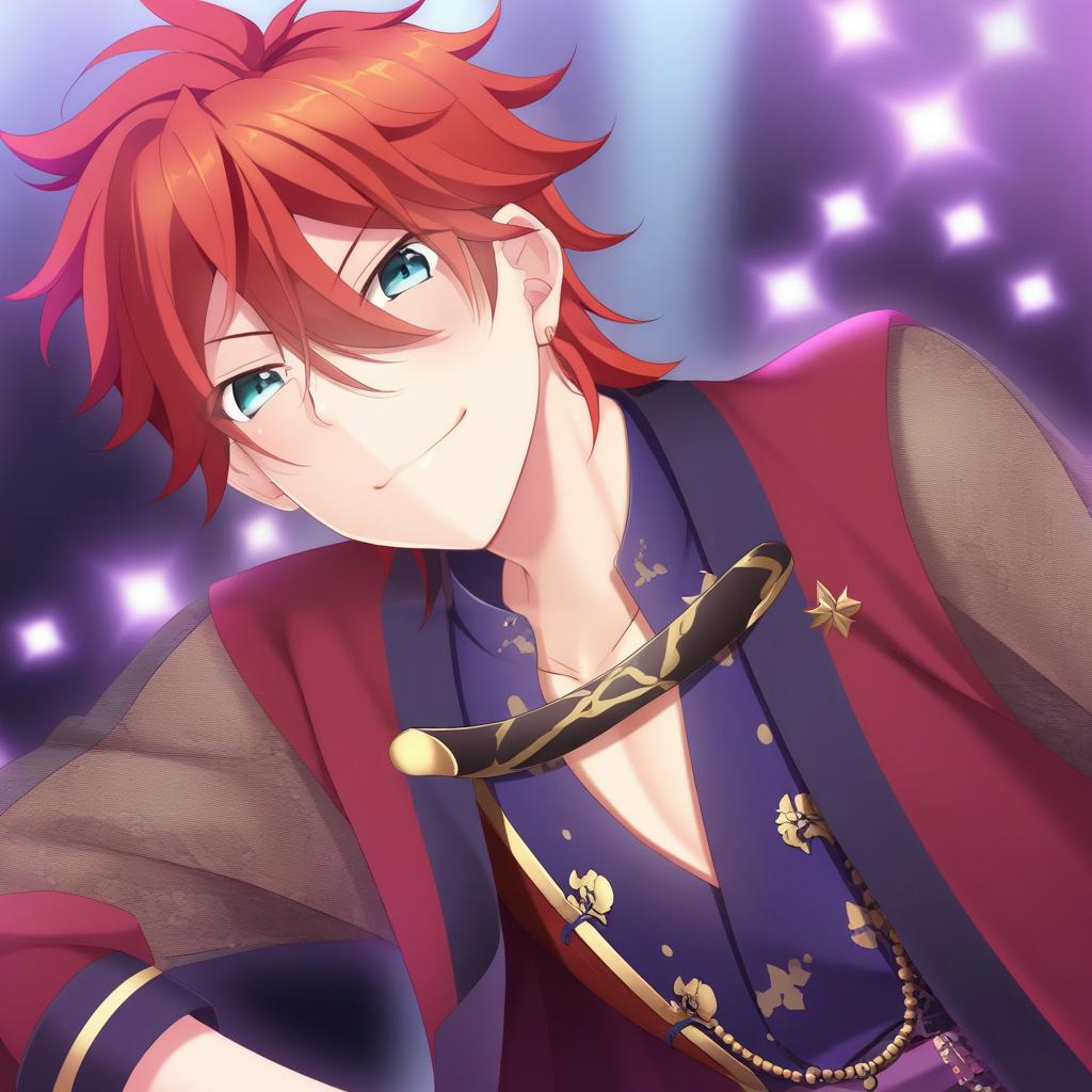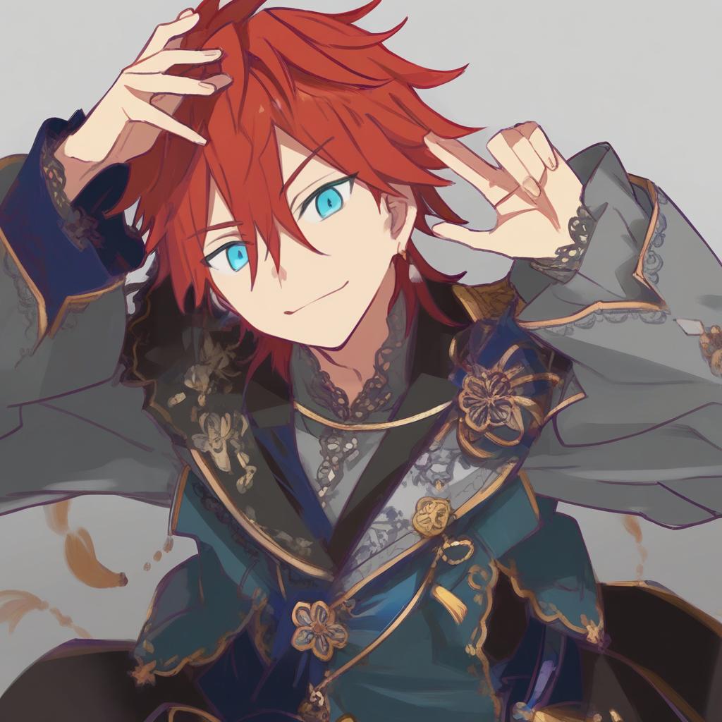 Amagi rinne, ensemble stars!, 1boy, blue eyes, hair between eyes, aqua eyes, red hair, short hair, long sleeves, earrings, by artist yuuji (yukimimi), animagine