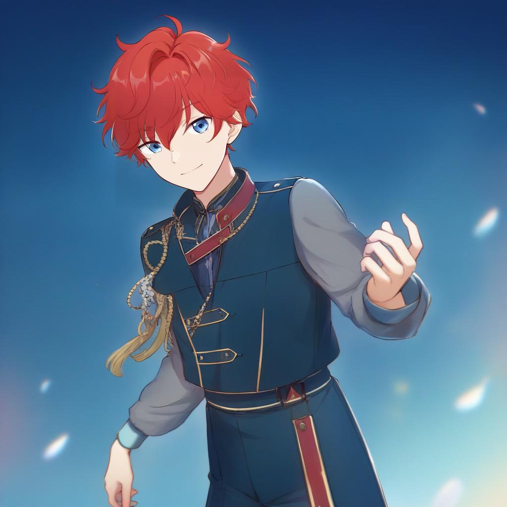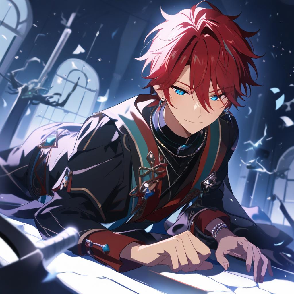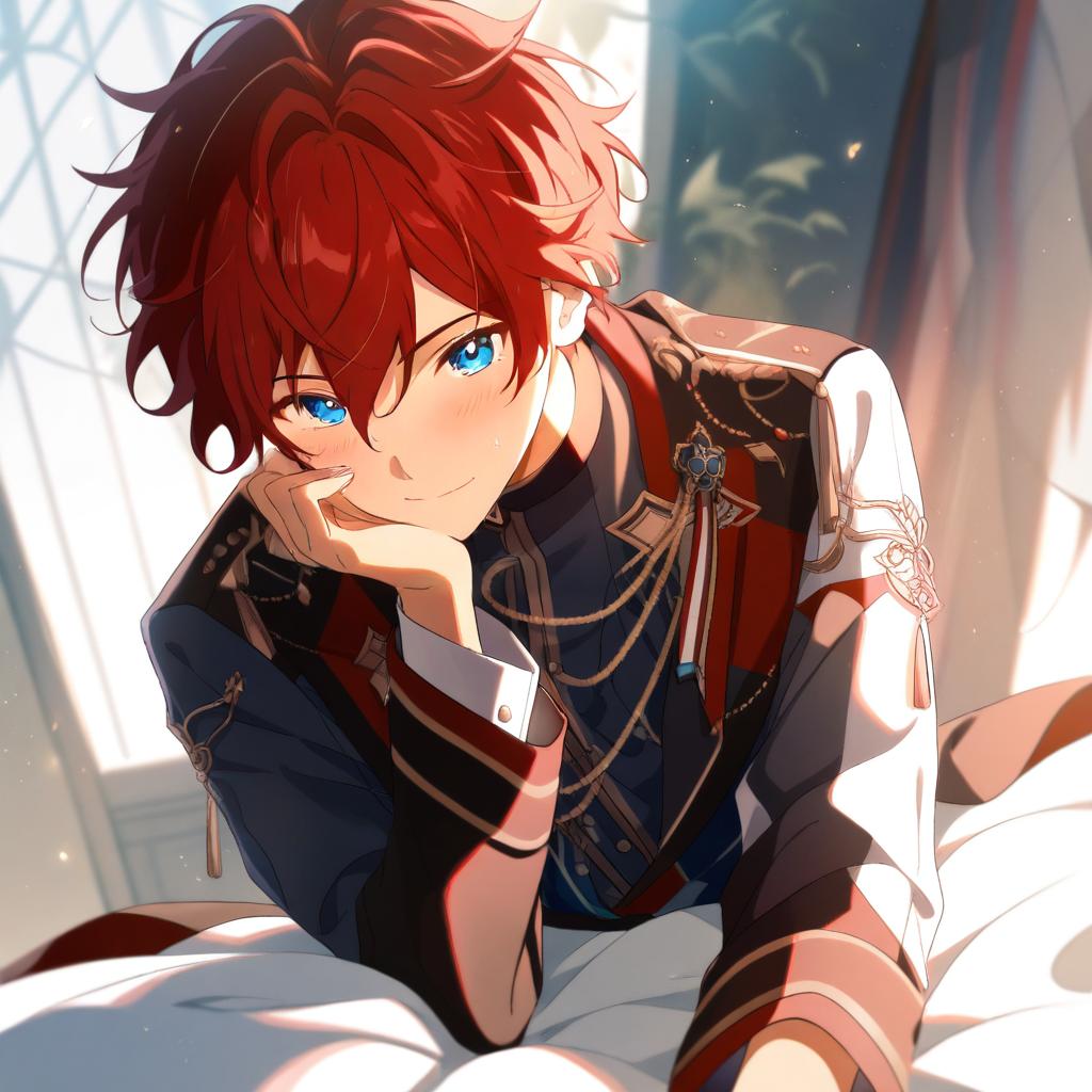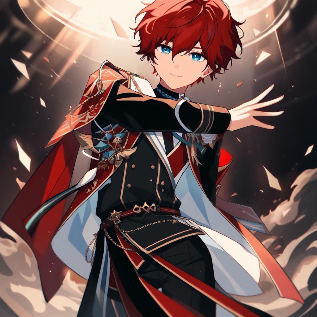 Digital anime artwork of a male character with vibrant red short hair and striking blue eyes. The character is wearing a detailed outfit featuring a white long-sleeve shirt and a red, green, and gold decorated cloak or cape with ornate chains and accessories. He is crouched in a relaxed pose with a confident expression, set against a softly lit background with scattered particles.