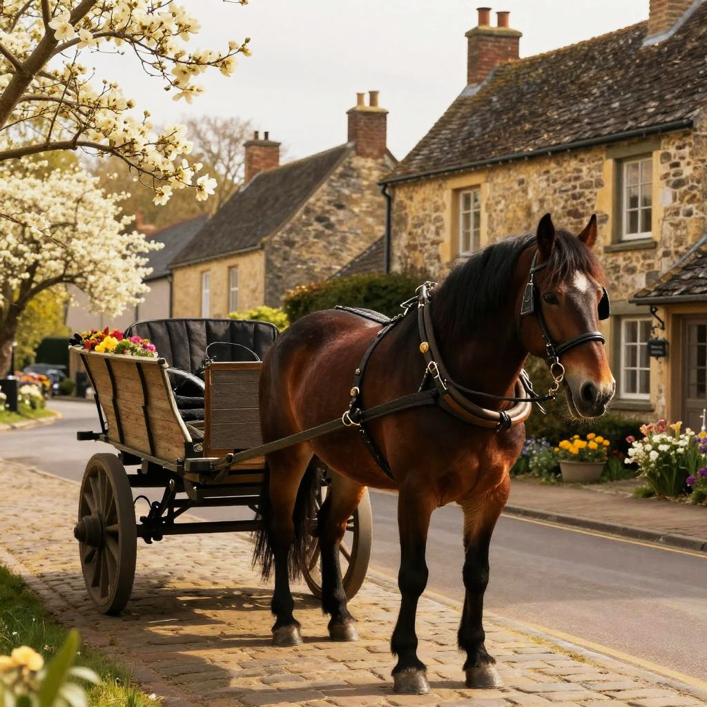 Ardenner draft horse pulling a vintage wooden cart along a cobblestone village street, surrounded by blooming spring flowers and rustic stone houses, warm golden hour lighting, highly detailed, painterly realism