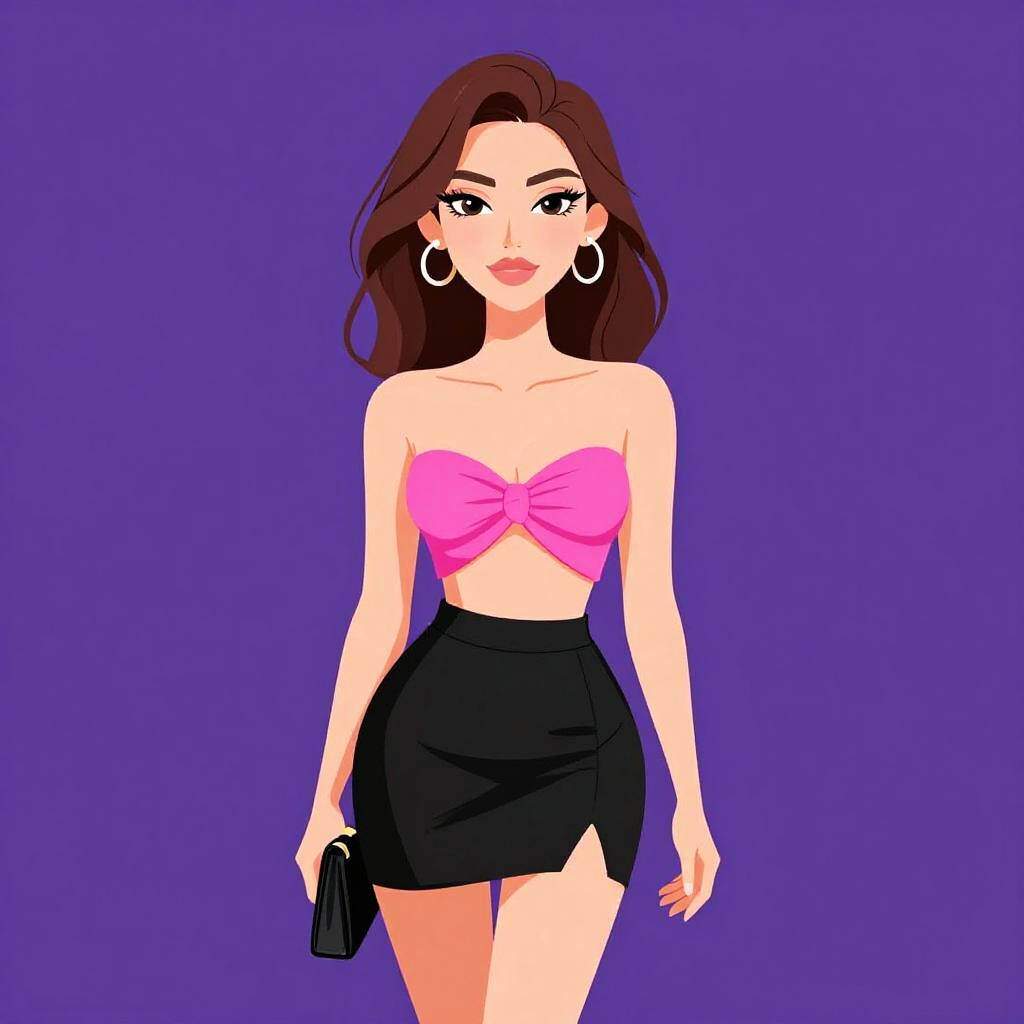Illustration of a woman with long dark hair wearing a sleeveless, white crochet knit mini dress with a scoop neckline and patterned weave. She accessorizes with layered beaded bracelets, hoop earrings, and a purple beaded necklace. The background is a simple purple circle, emphasizing the minimalist boho style.