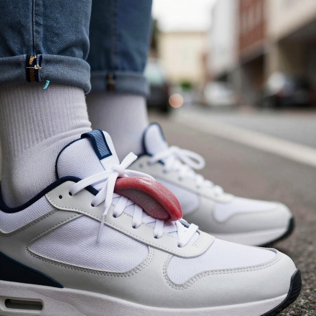 Close-up of shoe licking interaction, focused on a tongue touching a modern sneaker, sharp details, glossy materials, urban street background, dynamic lighting