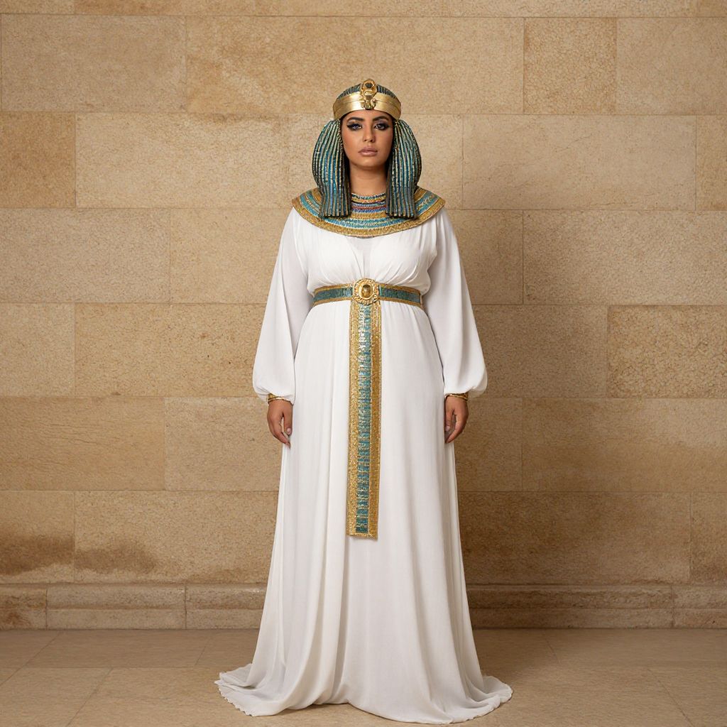 Photograph of a woman in an Egyptian-style white gown with gold and turquoise trim, striped blue and green headdress, standing against a beige stone wall