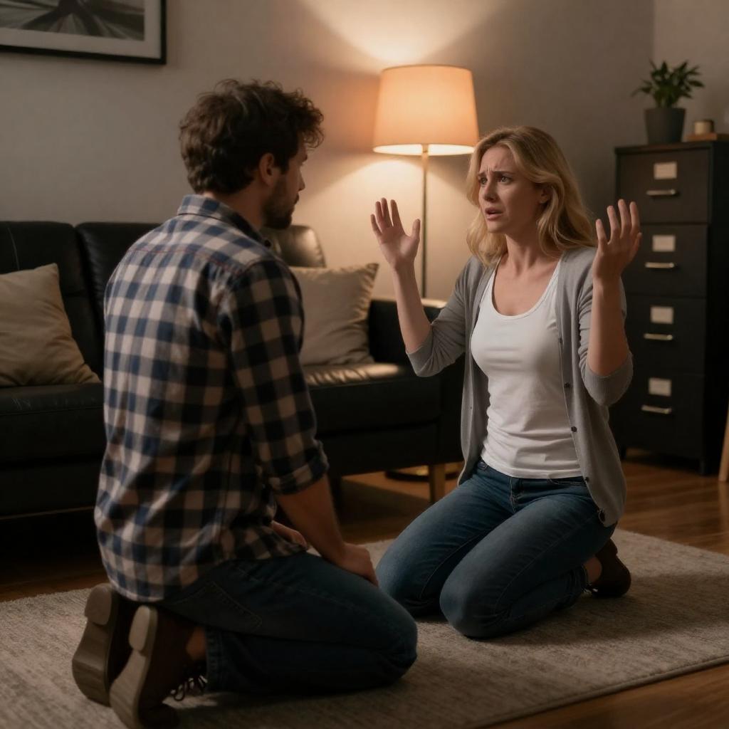 Photograph of a tense scene. Man in dark clothing, pointing aggressively at a woman in a pink robe, standing in a doorway. Woman with curly blonde hair, holding a hat. Round red rug on wooden floor. Bright lighting. Two people. Man's intense expression. Woman's surprised expression.