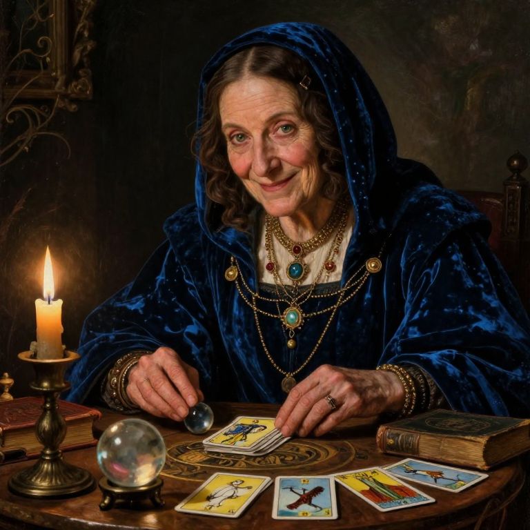 Imagine a Renaissance-style oil painting portrait of a weathered yet wise fortune teller with soft green eyes and an enigmatic smile. Soft candlelight illuminates dramatic shadows across her face, highlighting intricate multi-layered jewelry. From above, the focus is on the rich textures of her deep blue velvet cloak and delicate gold chains, alongside an ornate wooden table laden with ancient books, crystal balls, and tarot cards. This intimate, candlelit setting exudes a captivating aura of enigmatic wisdom.