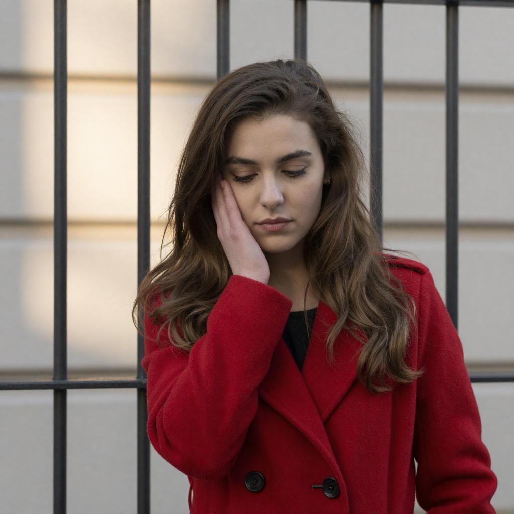 Photograph of a young woman with long, wavy brown hair, wearing a red coat, standing in front of vertical metal bars. She is looking down with a pensive expression, her right hand touching her cheek. The background features a patterned, ured wall illuminated by light from behind the bars.