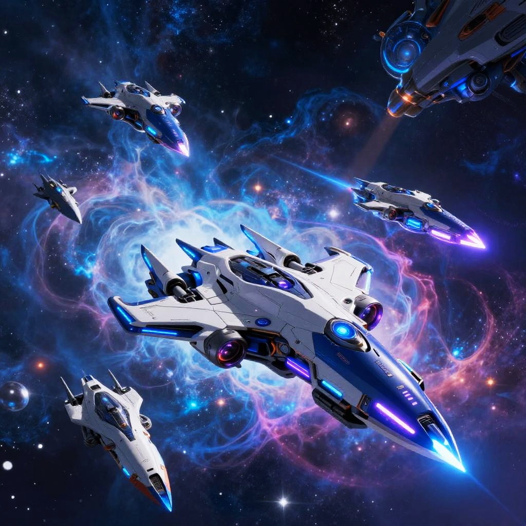 Anime starships soaring through a vibrant cosmic nebula, sleek futuristic designs with glowing blue and neon purple accents, dynamic angles, cyberpunk aesthetic, highly detailed digital art, energetic atmosphere, cinematic lighting