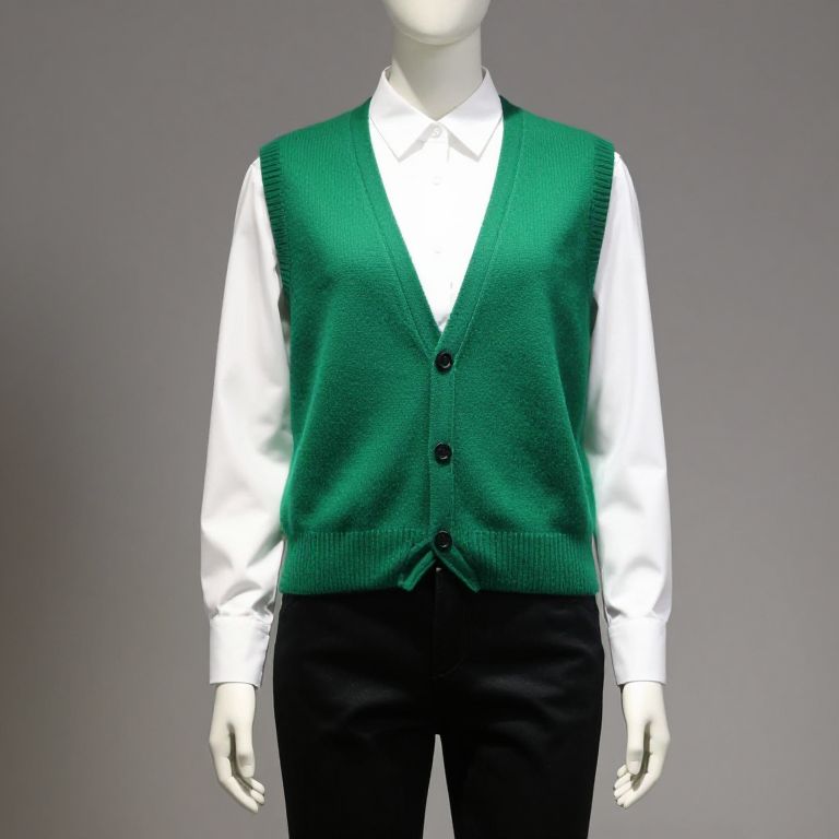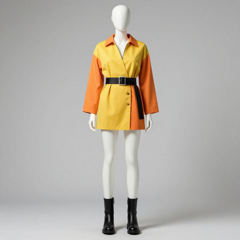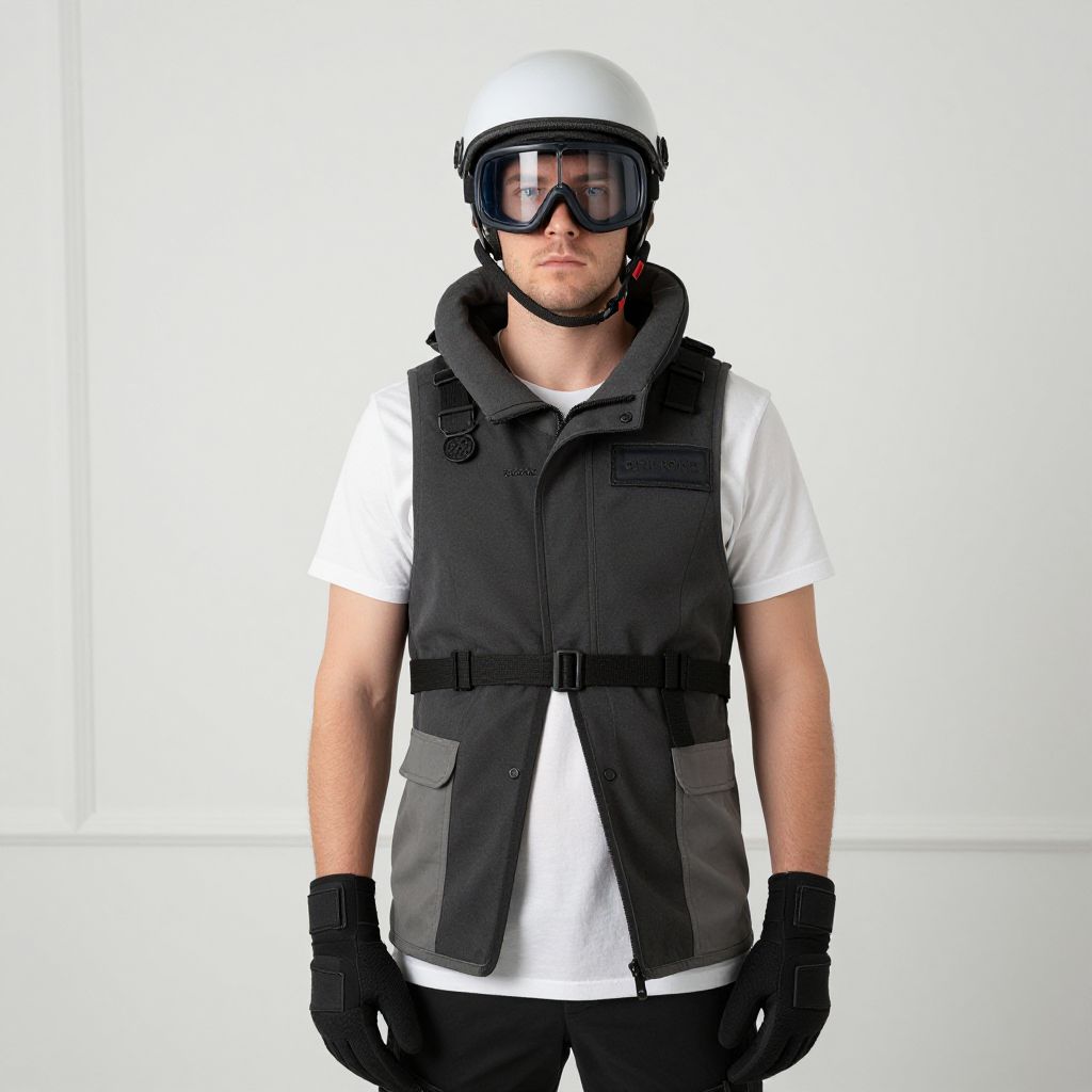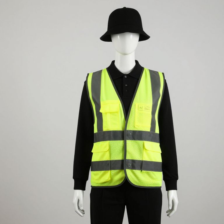 Photograph of a faceless mannequin wearing a green military-style jacket with chest pockets, black helmet, and white background.