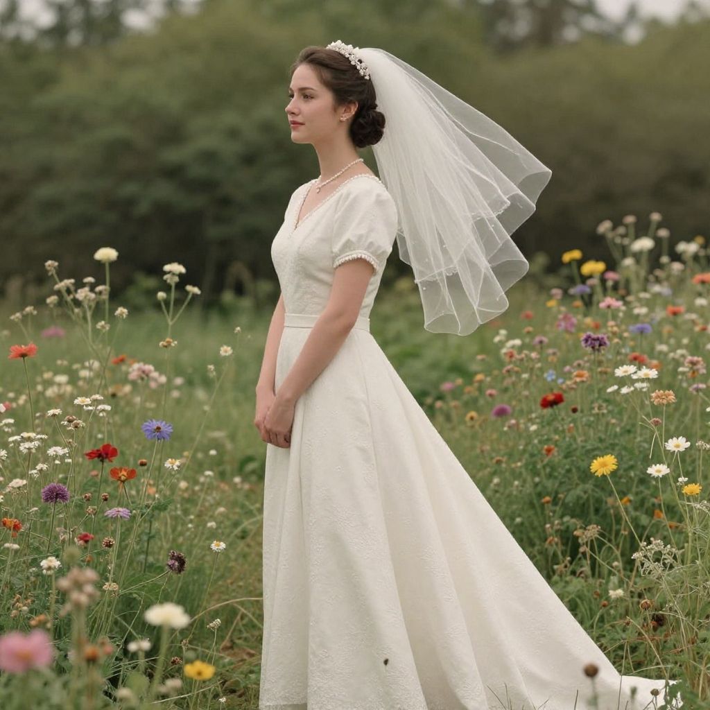 Photograph of a Caucasian woman with fair skin and dark brown hair, styled in an updo and adorned with a white floral headpiece and a long, sheer veil. She wears a simple, elegant white satin wedding dress with short sleeves and subtle lace detailing. She stands in a lush, colorful meadow filled with wildflowers, including red, yellow, white, and purple blooms. The background features green trees and a slightly blurred, natural setting. The woman is positioned in profile, facing right, with a serene and composed expression. The overall scene is bright and picturesque, evoking a sense of tranquility and natural beauty.