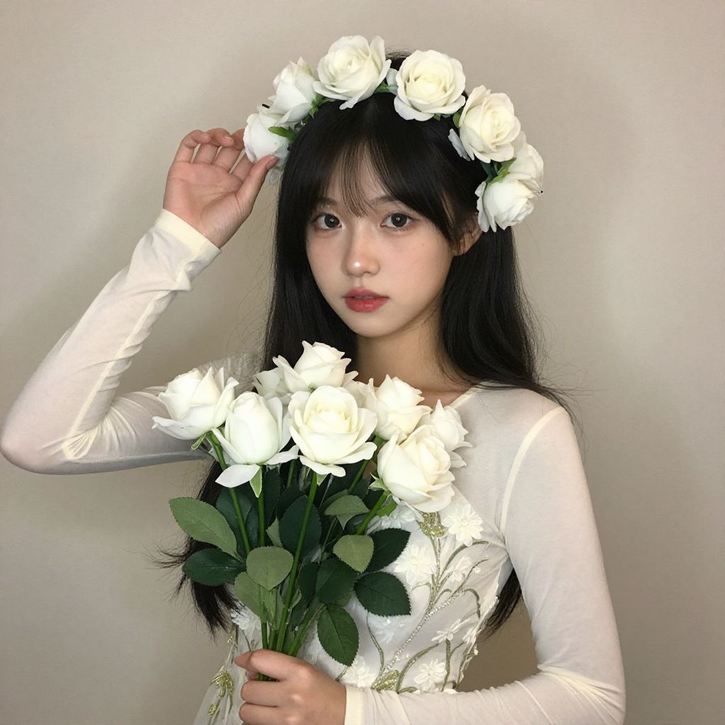 Photograph of an East Asian woman with long black hair, wearing a white long-sleeve dress with floral embroidery, holding a bouquet of white roses. She has a fair skin tone, red lipstick, and is wearing a crown of white roses on her head. Her right hand is raised to her head, touching the crown, while her left hand holds the bouquet. The background is a plain, light grey wall. The image has a soft, ethereal quality with a slight digital filter effect, emphasizing the white roses and creating a dreamy atmosphere.