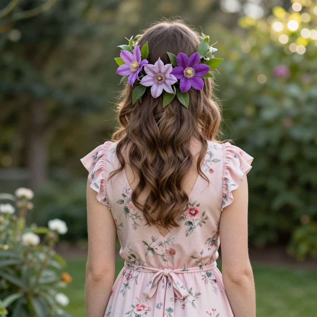 Back view of a woman wearing a delicate pink dress adorned with floral patterns, featuring ruffled sleeves and a tied waist, complemented by a headpiece of three vibrant clematis roses and green foliage, set against a serene garden backdrop with lush greenery and soft sunlight filtering through.
