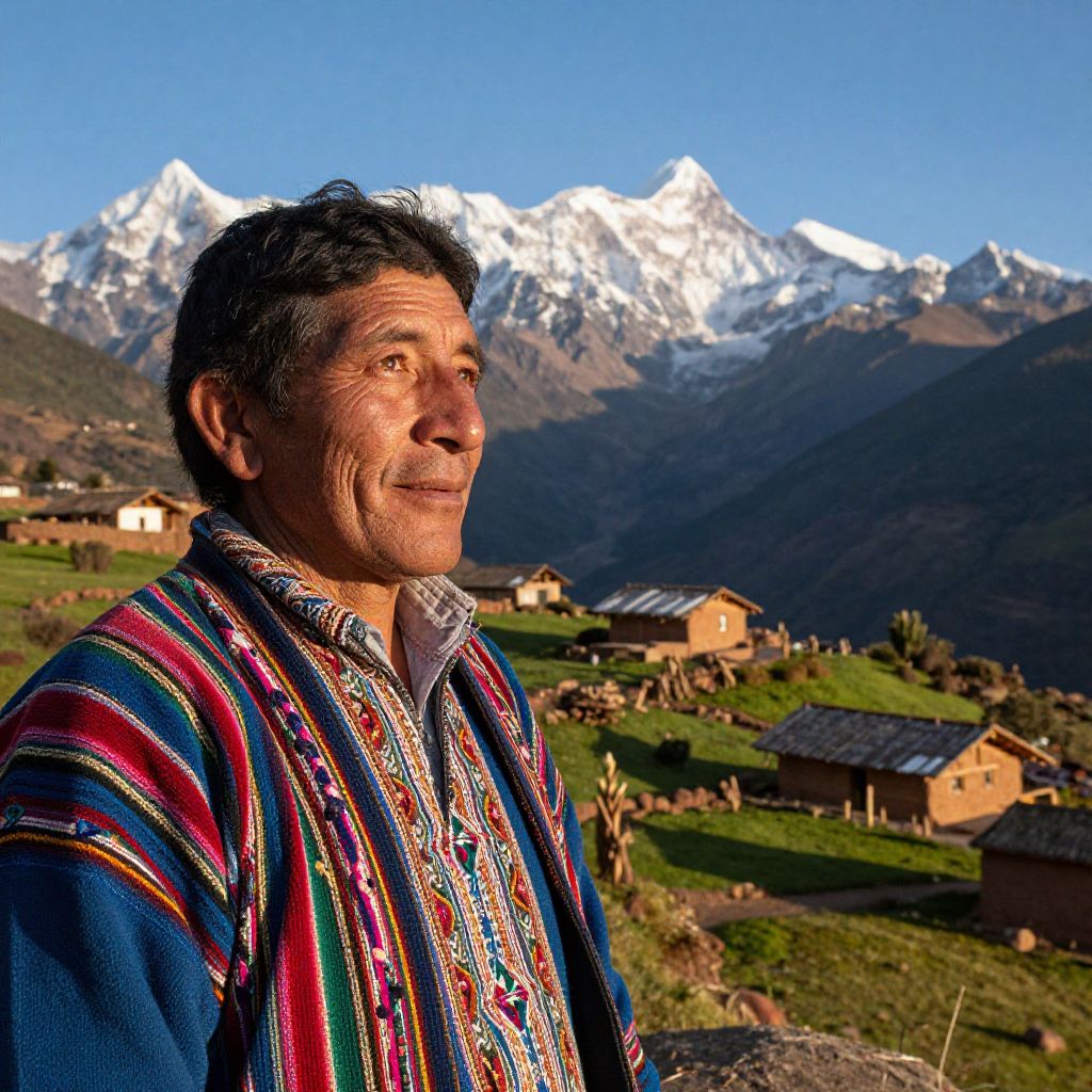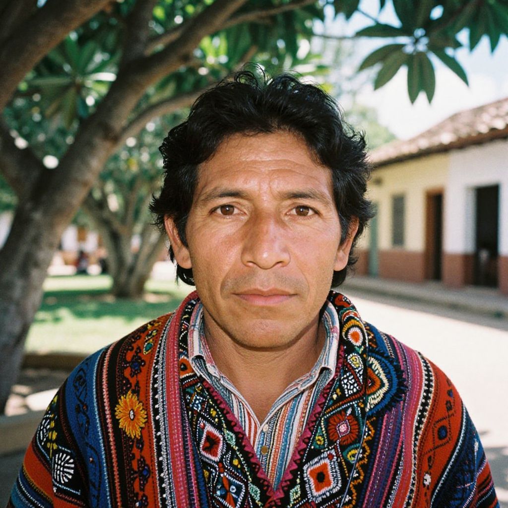 Captivating portrait of a man in Paraguay, framed by lush greenery, colorful textiles, and rustic architecture, shot through the warm, dreamlike haze of a vintage disposable camera, capturing the essence of his story, rich cultural heritage, and adventurous spirit, with a sense of nostalgia and authenticity. Man has masculine face and piercing eyes