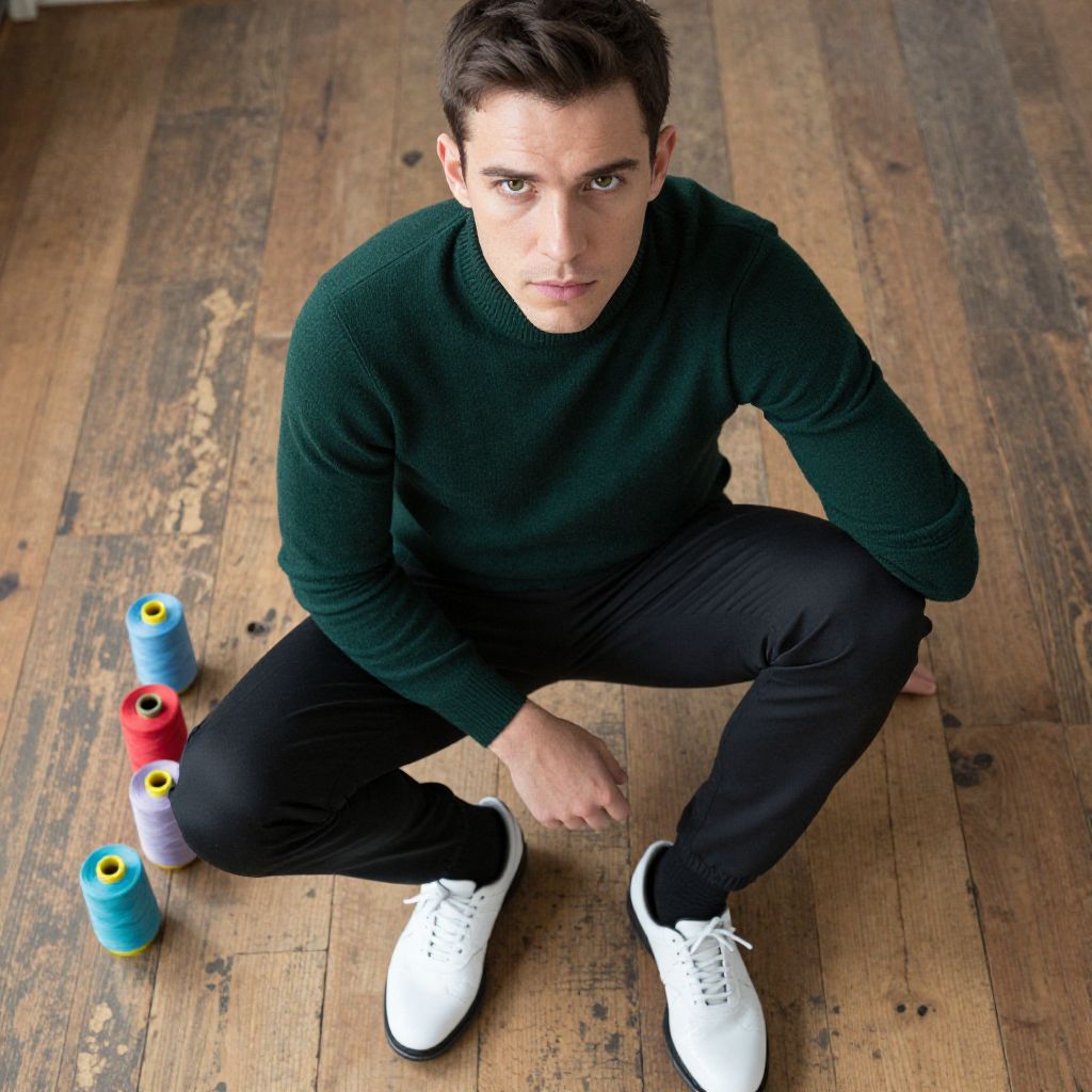 A man, dark green golf turtleneck, black slim fit joggers, sporty white golf shoes, vibrant spools of thread, worn wooden floors, overhead shot, focused expression, casual yet refined vibe. Man has masculine face and piercing eyes