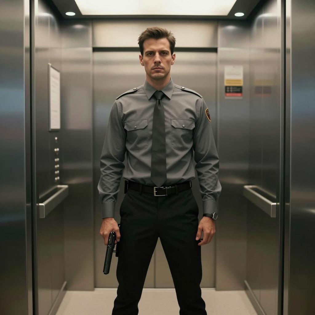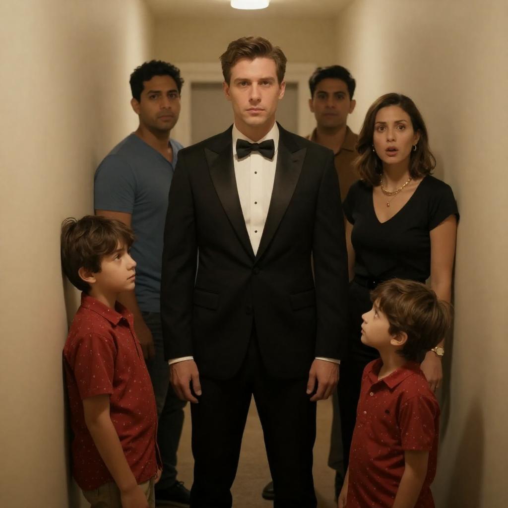 Photograph of four men in a dimly lit hallway with orange lighting. Foreground: dark-haired man with surprised expression. Center: muscular man with short brown hair, slight smile. Background: bearded man in blue uniform, serious expression. Far background: man in dark attire, obscured face. Doorframe on the right.