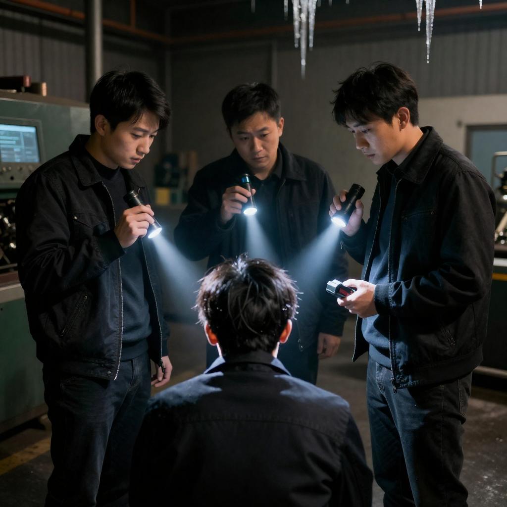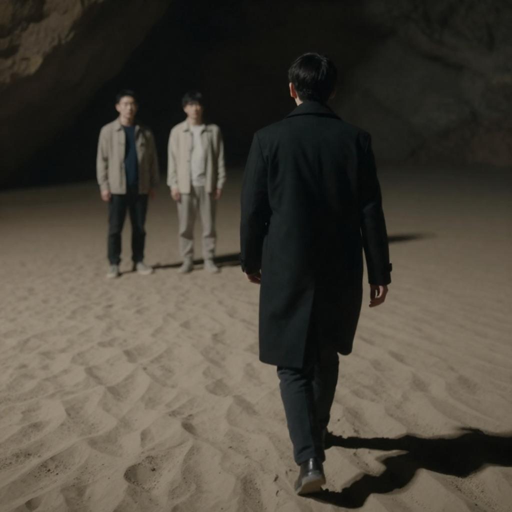 Silhouetted man in a long coat stands in a dark, narrow, wet tunnel with rough, ured walls. Dim light highlights his profile, casting shadows. Two indistinct figures crouch in the background near a grimy door.