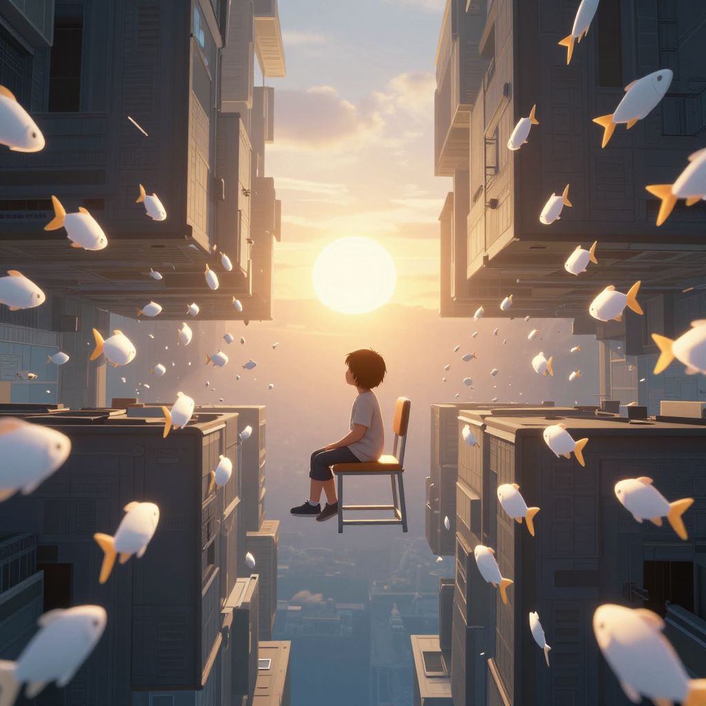 In a surreal, computer-generated digital art scene, a child sits on a floating chair amidst an inverted gravity alley, surrounded by a school of luminous, paper-like fish that dissolve into light as they approach the radiant golden hour sun, creating a dreamlike, high-definition fantasy atmosphere.