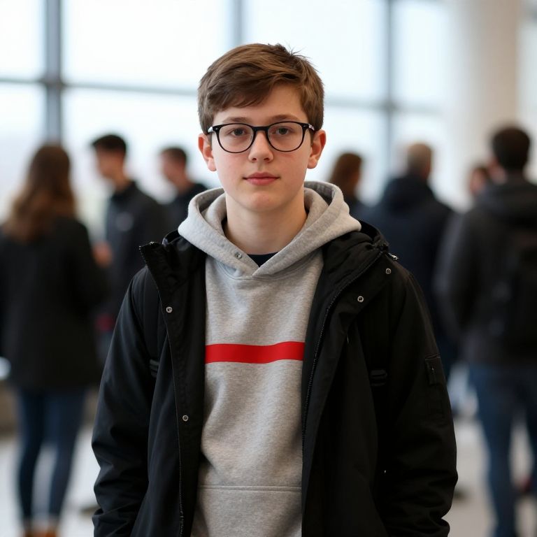 Photograph of a young white male with short brown hair and black-framed glasses standing in a blurred indoor setting. He wears a grey hoodie with a red stripe, layered under a black jacket. His expression is neutral, and he gazes directly at the camera. The background is out of focus, featuring indistinct figures of other people, suggesting a public or school environment. The lighting is bright, highlighting his face and upper body. His skin is fair, and the overall style is casual and modern.
