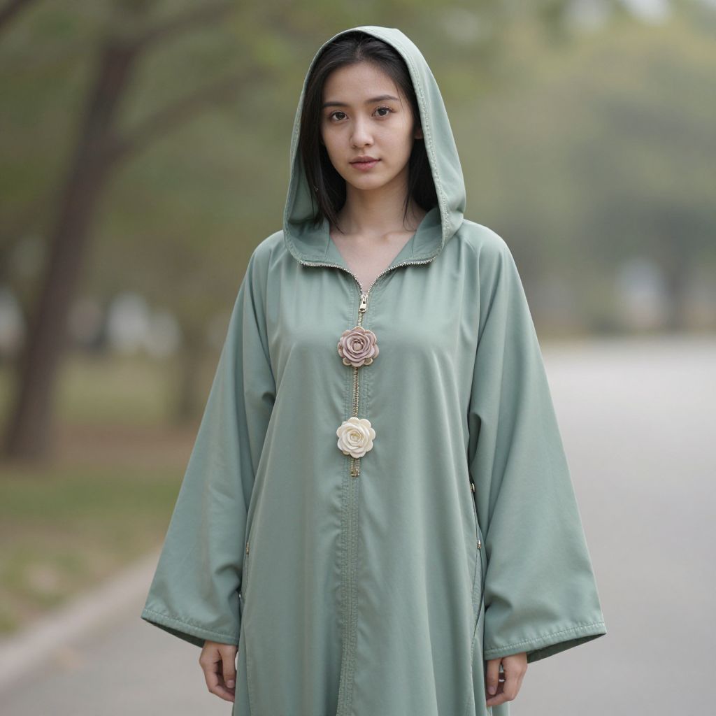 "sage green abaya, solo, 1girl, flower, looking at viewer, hood, outdoors, robe, standing, blurry, closed mouth Realistic photo of casual sexy person with pretty face"