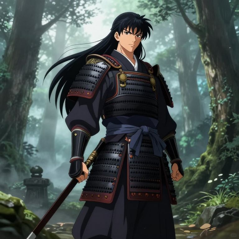 Anime-style digital drawing of a serious, long-haired samurai in black armor and hakama, standing in a misty forest with sunlight filtering through trees