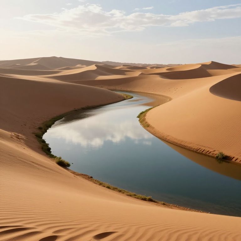 Photograph of a serene desert landscape featuring undulating sand dunes with rippled textures in warm orange and beige tones. A narrow, reflective watercourse winds through the center, mirroring a partly cloudy sky. Sparse green vegetation lines the water's edge. The sun casts soft shadows, enhancing the dunes' contours. The background displays distant, hazy dunes under a bright, blue sky. The image captures the contrast between the arid sand and the calm, reflective water.