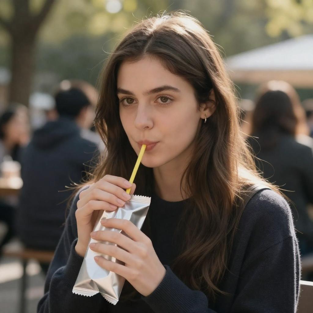 Woman with long brown hair, wearing a dark sweater, holding a silver-wrapped snack with a yellow straw, sitting outdoors. Background includes blurred people and greenery. Soft, focused expression on her face. Sunlight filtering through trees.