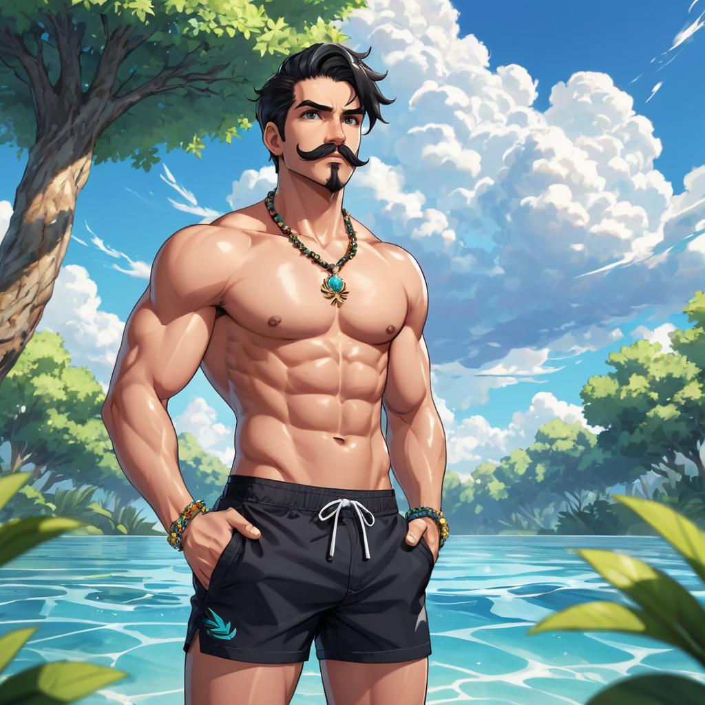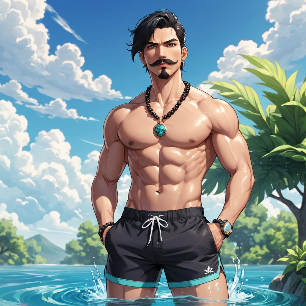 1boy, male focus, facial hair, abs, necklace, jewelry, water, mustache, beard, topless male, outdoors, cloud, solo, muscular, sky, day, swim trunks, male swimwear, plant, hands in pockets, black hair, tree, navel, pectorals, full body