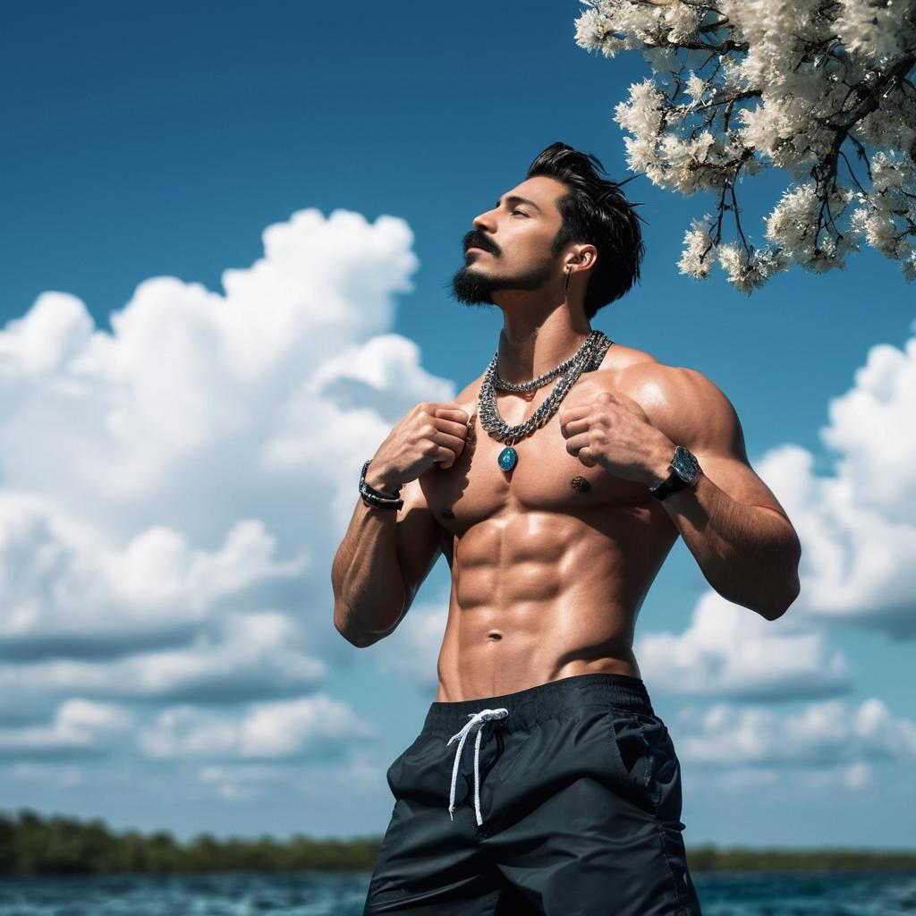 Athletic man with a muscular build standing confidently near a body of water surrounded by lush greenery and under a vibrant blue sky with fluffy white clouds. He is shirtless, wearing dark blue swim shorts, and accessorized with a large necklace and bracelets.