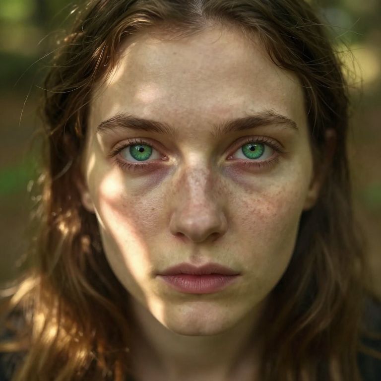 This is a close-up photograph of a young woman with light skin and green eyes, set against a softly blurred forest background. She has wavy, brown hair that falls around her face, and her expression is serious and focused. Sunlight filters through the trees, casting dappled shadows on her face, highlighting her freckles and giving a natural, almost ethereal glow. Her eyebrows are slightly arched, and her lips are slightly parted. The photograph has a slightly surreal, almost hyper-real quality, with vivid colors and sharp details. The background is composed of green foliage and brown tree trunks, slightly out of focus.
