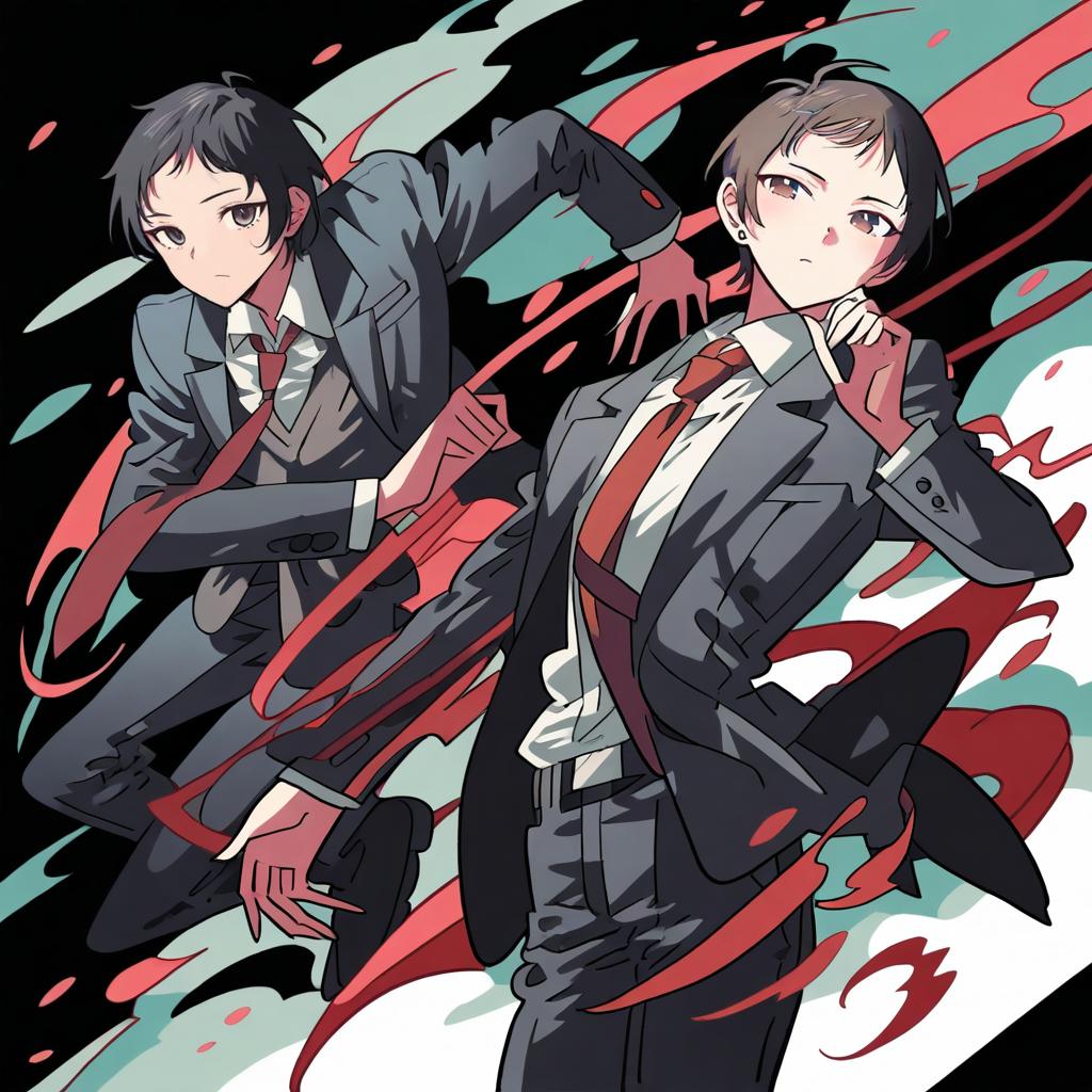 Adachi tooru, persona, 1boy, black hair, short hair, suit, white shirt, collared shirt, necktie, red necktie, formal, formal, by artist meremero, animagine