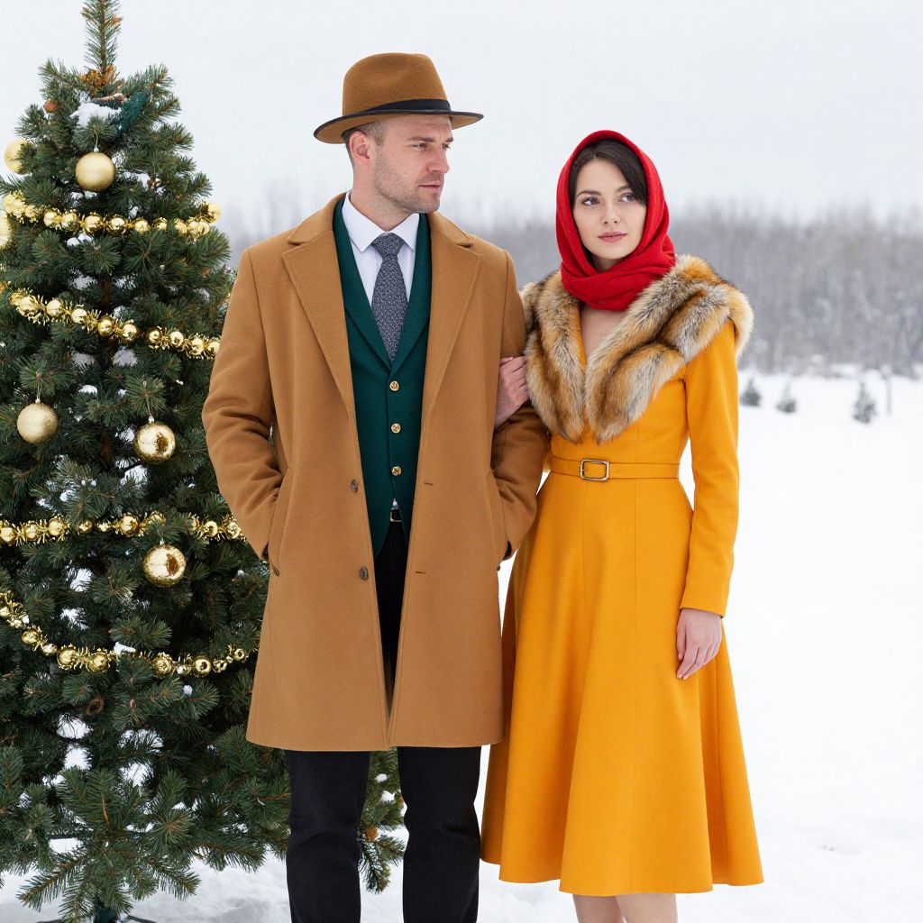 Elegantly dressed couple stands side-by-side in a snowy winter scene, with the man wearing a mustard-colored overcoat, green vest, and brown hat, while the woman dons a vibrant orange dress with fur-trimmed collar and festive red headscarf, both positioned near a decorated Christmas tree adorned with golden ornaments and garlands.