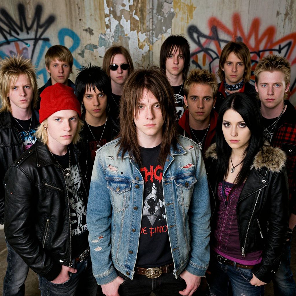 The image depicts a group of teenagers in a grunge band from the 90s alternative rock scene, posing for a photo that could serve as a movie poster. The group is composed of eight individuals, all dressed in edgy, worn-out clothing that reflects the grunge aesthetic. The central figure, a young man with long, tousled hair, stands prominently in the foreground, wearing a distressed denim jacket over a black t-shirt with red text. To his left, a boy with spiky blonde hair and a red beanie gazes intently, while another boy with short, dark hair and a leather jacket stands slightly behind him. To the right, a girl with long, dark hair and a black jacket with a fur-lined collar looks directly at the camera, her expression serious. The background features a weathered wall with peeling paint and graffiti, adding to the gritty, urban atmosphere. The overall composition is dynamic, with the teenagers arranged in a semi-circle, creating a sense of unity and camaraderie. The interplay of colors, textures, and shapes, including the distressed fabrics and the rough, textured wall, enhances the gritty, rebellious vibe of the scene.