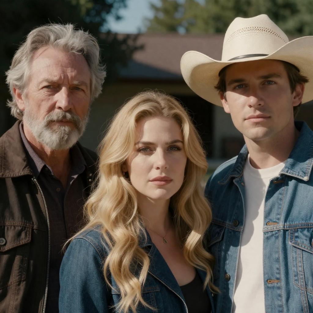 A group of three adults standing outside a movie theater entrance. The woman on the left has curly blonde hair, wears sunglasses, a red jacket, and a striped shirt. The woman in the center has long blonde hair, a pink wide-brimmed hat, red jacket, and white shirt. The man on the right has black hair, a beard, and is dressed in a green jacket over a brown shirt. They appear to be looking up, with a marquee sign and outdoor stairs in the background surrounded by trees under overcast lighting.
