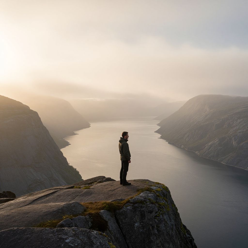 Tranquil Fjord Landscape with Solitary Figure
