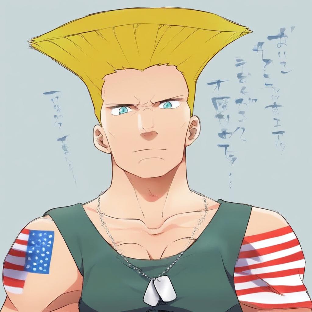 Digital illustration of Guile, a muscular male character from Street Fighter, featuring distinctive blonde flattop hair, blue eyes, and American flag tattoos on both arms. The character wears a dark green sleeveless top and military-style dog tags on a chain necklace. Background includes subtle Japanese text.