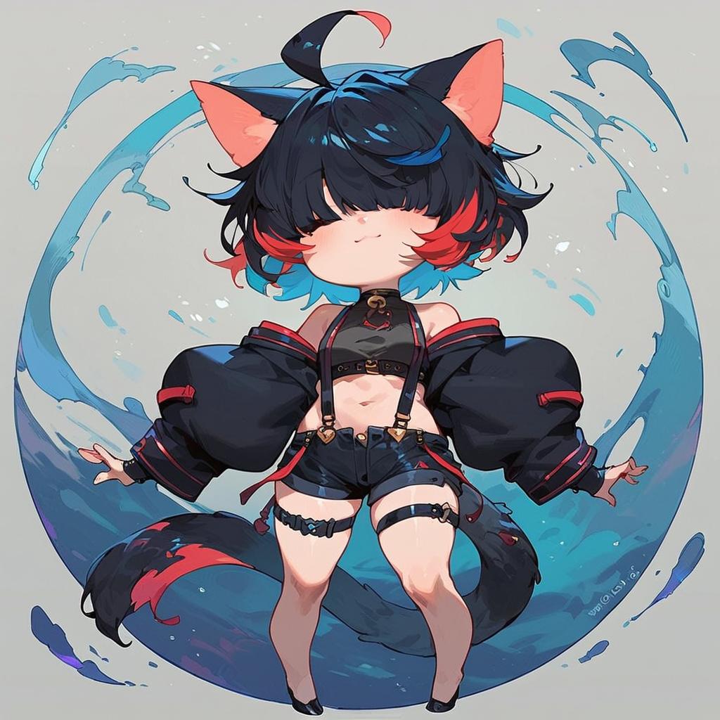 Digital illustration of a chibi-style character with cat ears and a fluffy tail. The character has short, multicolored hair in black, red, and blue shades, styled with bangs covering the eyes. Wearing a black crop top with suspenders, long puffy sleeves with red accents, short black shorts, and thigh straps. The character stands confidently in front of an abstract circular blue water splash background.