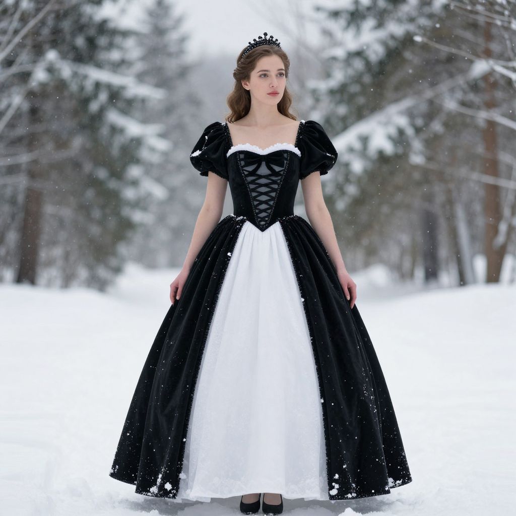 Snow Whites Dress, woman in a black and white dress standing in the snow