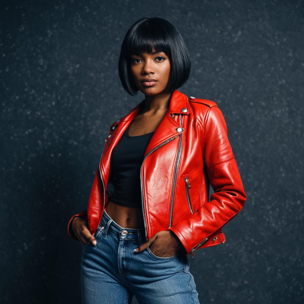 Portrait of a young Black woman with a sleek black bob haircut wearing a red leather jacket over a black tank crop top and blue jeans. The background is a dark solid color with bokeh light effects, adding a stylish and modern atmosphere to the image. The woman's natural makeup complements her confident pose.